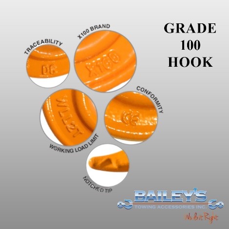 - Additional Grade 100 Hook features include a Powder Coated Hi-Viz Safety Orange Hook and they are 100% Proof Tested at 2.5 Times the Working Load Limit.