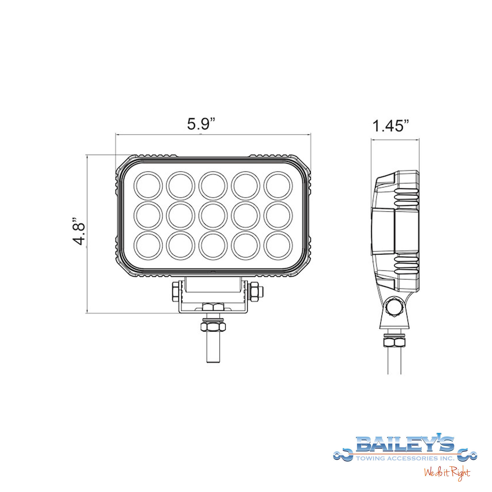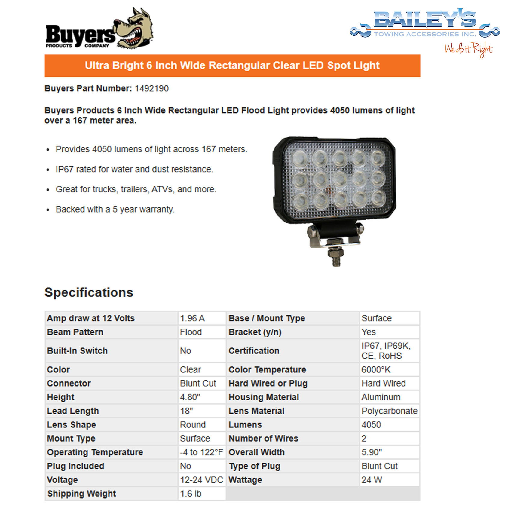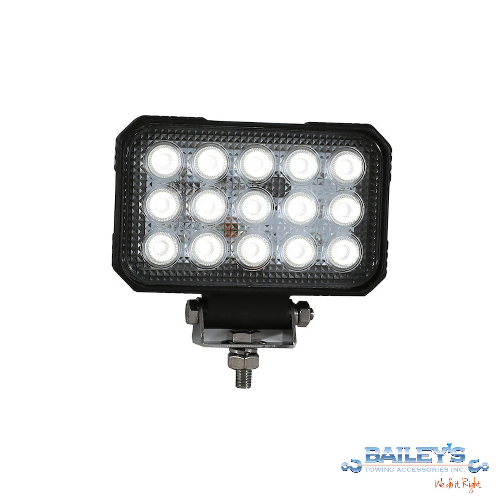 Ultra Bright 6 Inch Wide Rectangular LED Flood Light has a die cast aluminum body and impact-resistant polycarbonate lens. This durable design makes the light perfect for both on-road and off-road applications. This light has 15 high intensity LEDs and provides 4050 lumens of light for 167 meters. Installation is easy with a stud mount and 18 in. blunt cut lead. The light is IP67 rated for water and dust resistance.