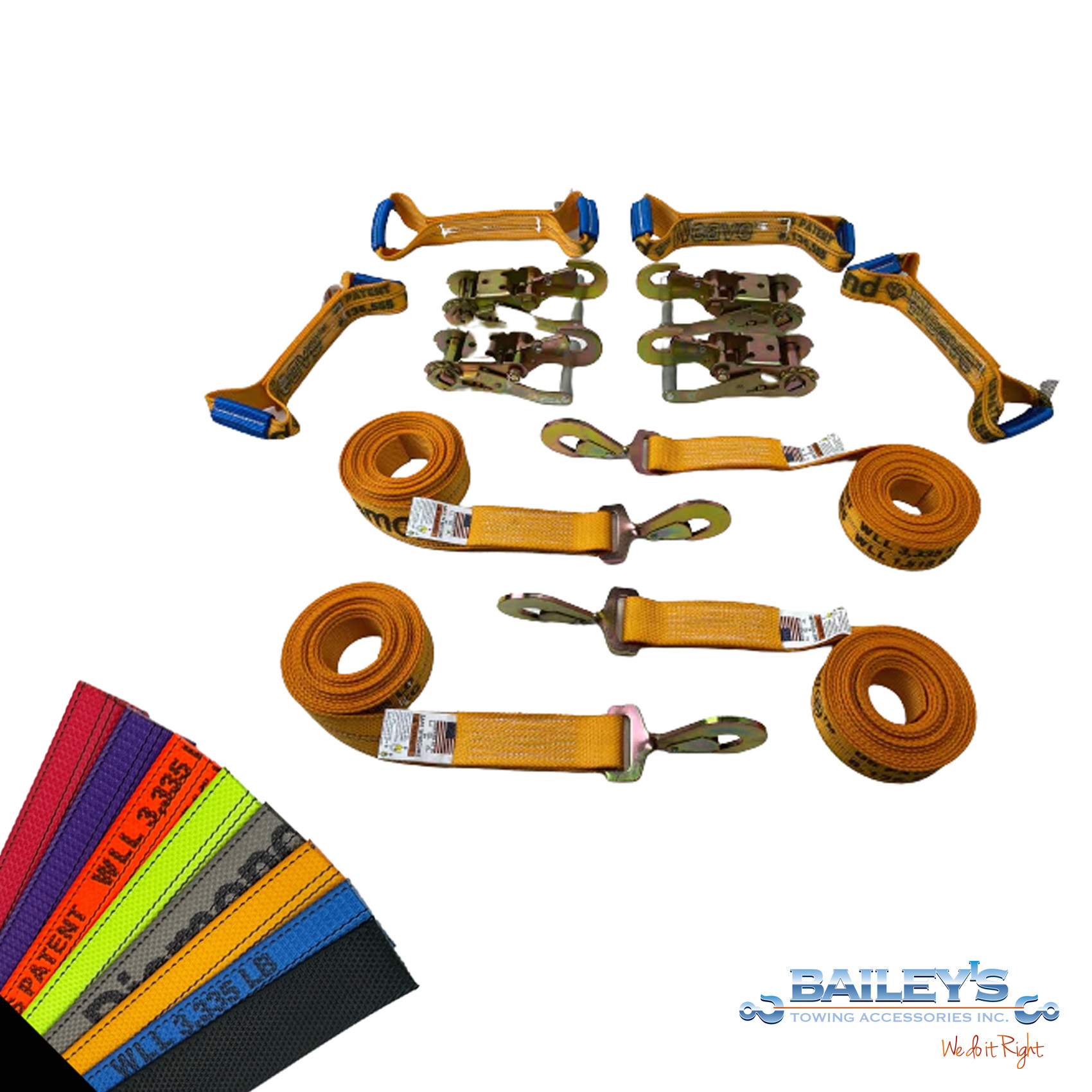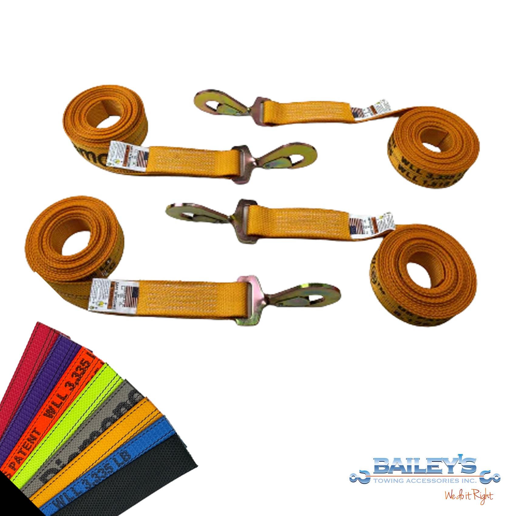 The straps have a working load limit of 3,333 lbs. and is made in the USA from Premium DIAMOND WEAVE Webbing. Diamond Weave webbing is a customer favorite because of its durability. The option of colors is also a great option to match fleet colors or choose a darker color to hide dirt.