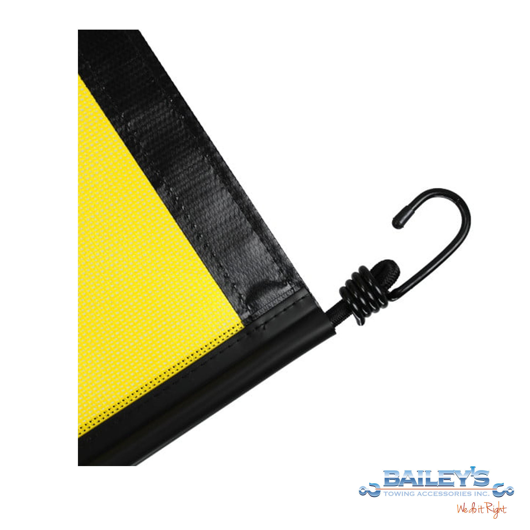 Durable vinyl coated poly-mesh material allows airflow. Sewn into a strong flexible welt with heavy 18″ bungee on each end. Wrap around double stitch border. Bold black letters hand silk screened on yellow background. Easy to attach and easy to clean.