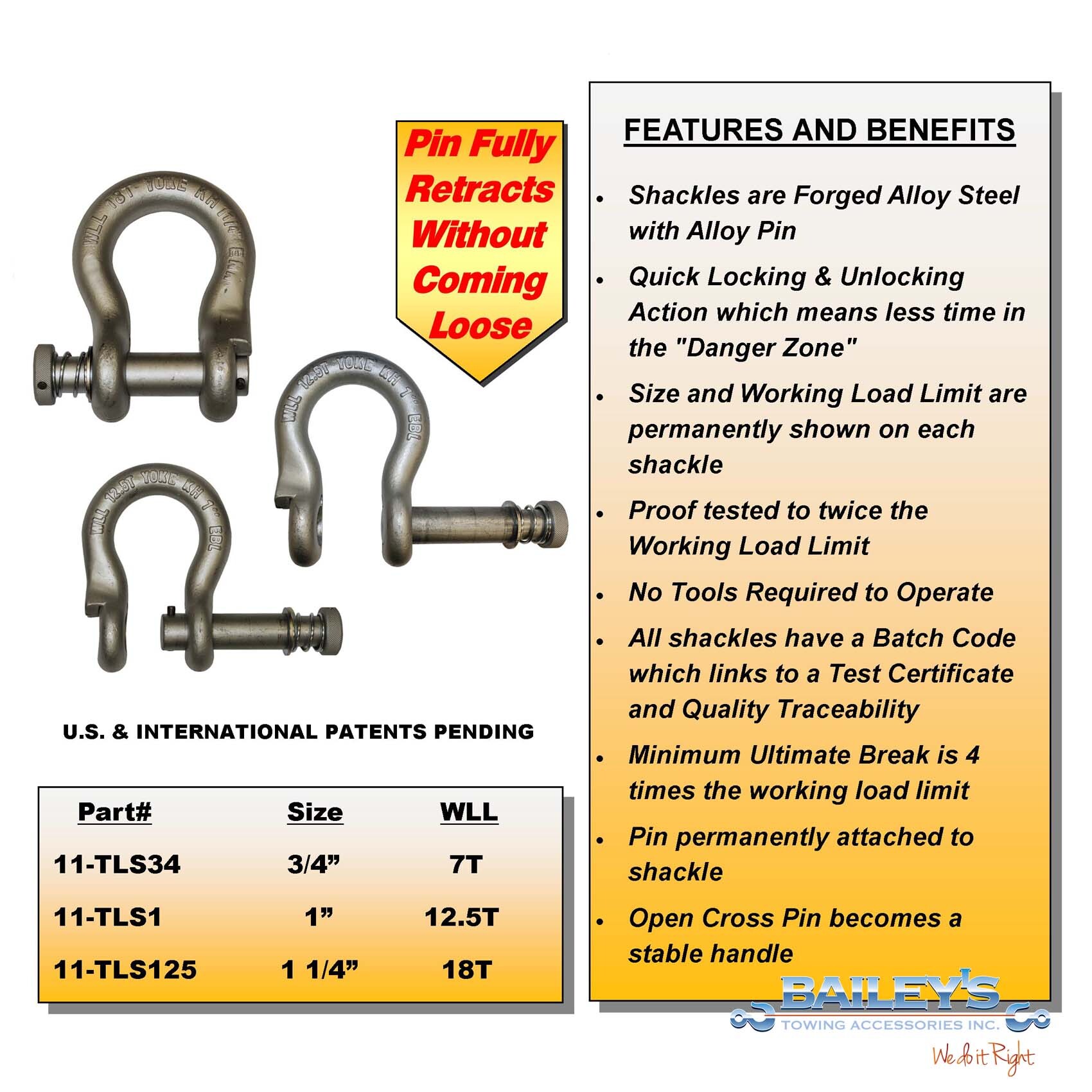 | Twist Lock Shackle Size | 3/4" 7 Tons P/N: 11-TLS34, 1" 12.5 Tons P/N: 11-TLS1, 1-1/4" 18 Tons P/N: 11-TLS125 |